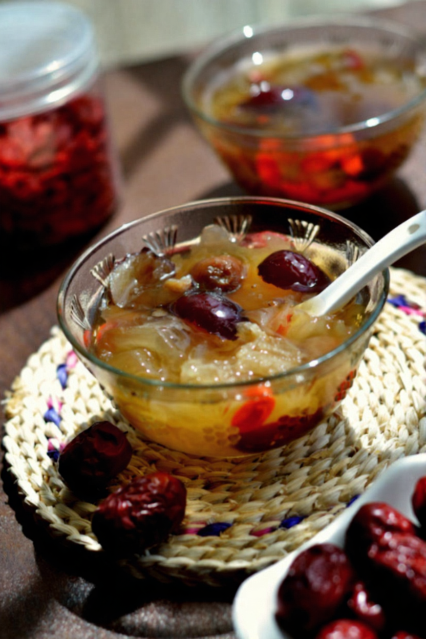 A traditional nourishing dessert, red dates enrich blood and beautify the complexion, white fungus moistens the lungs and relieves coughs. This sweet soup is light, sweet, and moisturizing, perfect for consumption during dry winter periods to effectively moisten the lungs and beautify the skin.